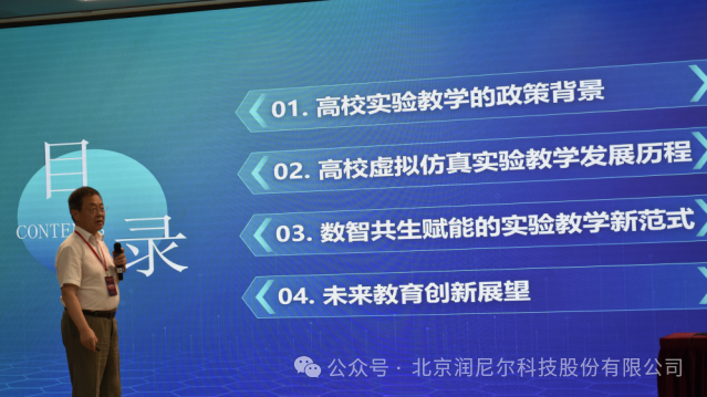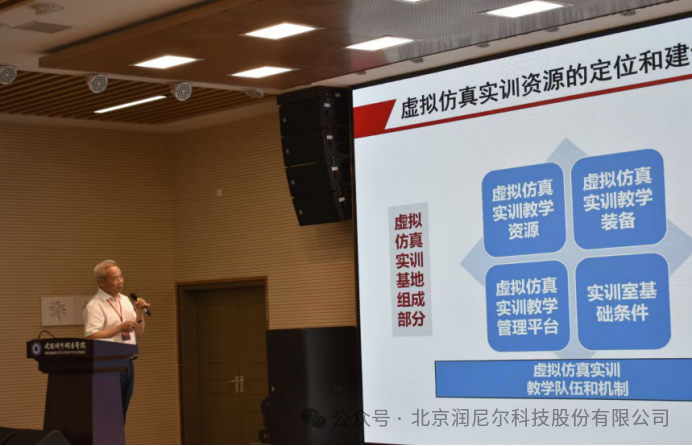 协办单位北京润尼尔科技股份有限公司副总裁罗涛,在《人工智能背景下的虚拟仿真实训基地建设实践与探索》报告中,提出了基于国家政策导向的"资源-平台-环境"三位一体的建设框架,强调通过AI技术实现智能学伴、实时指导、个性化评价等功能,有效解决实训教学中的"三高三难"问题,展示了虚实融合的智能化实训场景,并详细介绍了校级管理平台的数据驱动管理模式。通过产教融合实现资源开发、应用推广与人才培养的闭环发展。