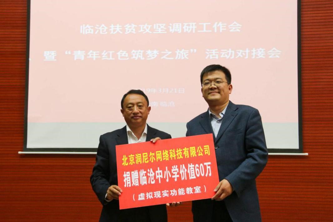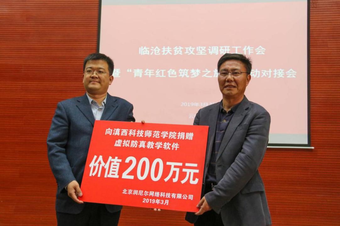 北京润尼尔公司作为调研团成员之一,在教育部高教司的带领下,以实际行动践行爱心,向滇西科技师范学院捐赠价值200万的虚拟仿真软件,向临沧中小学捐赠价值60万虚拟现实功能教室设备和软件,这是北京润尼尔第二次向滇西的学校捐赠,上一次为大理大学和滇西应用技术大学分别捐赠了价值350和320万的虚拟仿真实验教学软件。