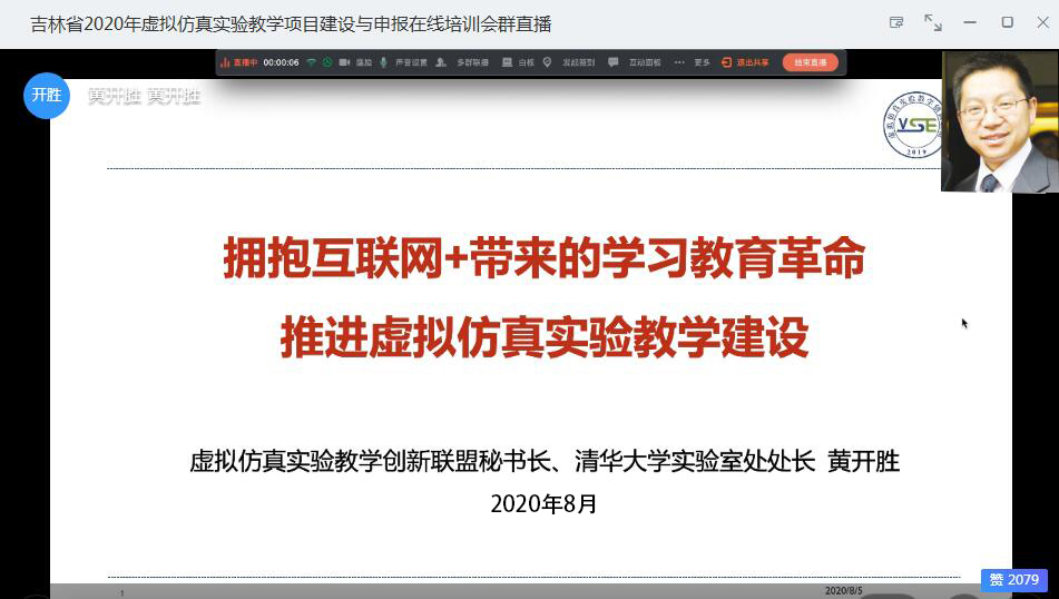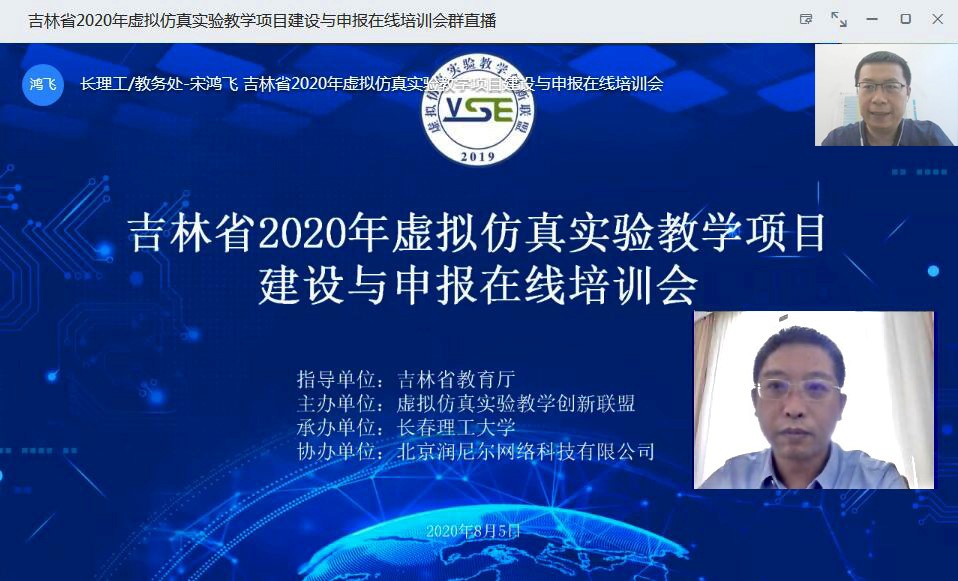 为贯彻落实教育部《关于一流本科课程建设的实施意见》和《教育部办公厅关于2017-2020年开展示范性虚拟仿真实验教学项目建设的通知》精神,推进信息技术与实验教学的深度融合,加强实验教学优质资源建设与应用,促进实验教学资源开放共享,提高实验教学质量和实践育人水平,进一步推动实验教学改革与创新,由吉林省教育厅指导,虚拟仿真实验教学创新联盟主办,长春理工大学承办,北京润尼尔网络科技有限公司协办的“吉林省2020年虚拟仿真实验教学项目建设与申报在线培训会”于8月5日以在线方式顺利举行。会议由长春理工大学教务处宋鸿飞副处长主持。全国共有55所高校的917名老师参会,其中吉林省47所高校的909名老师参加,累计3721人次观看直播。
