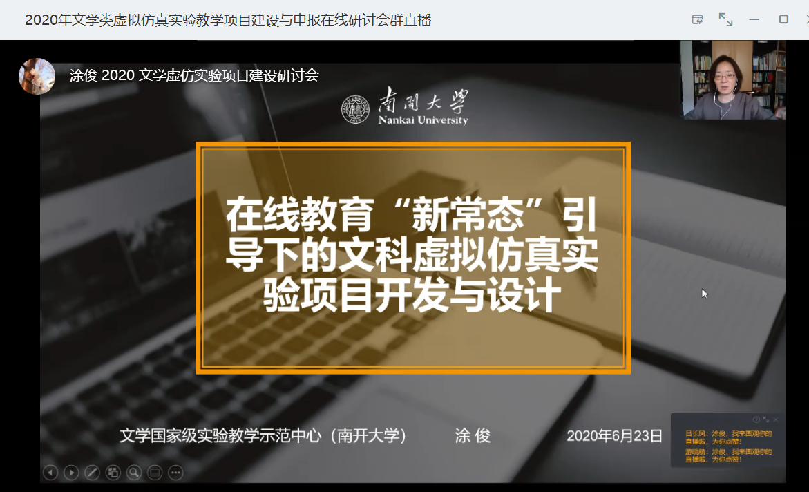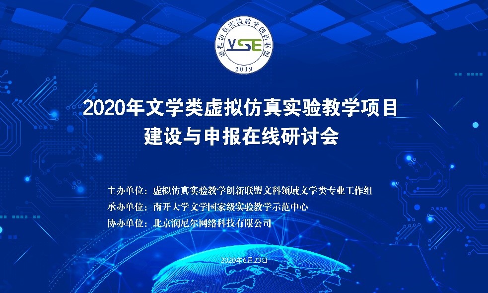 为贯彻落实教育部《关于一流本科课程建设的实施意见》和《教育部办公厅关于2017-2020年开展示范性虚拟仿真实验教学项目建设的通知》精神,推进信息技术与实验教学的深度融合,加强实验教学优质资源建设与应用,促进实验教学资源开放共享,提高实验教学质量和实践育人水平,进一步推动实验教学改革与创新,由虚拟仿真实验教学创新联盟文科领域文学类专业工作组主办,南开大学文学国家级实验教学示范中心承办,北京润尼尔网络科技有限公司协办的“2020年文学类虚拟仿真实验教学项目建设与申报在线研讨会”于6月23日以在线方式顺利举行。
