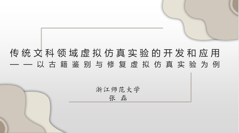 浙江师范大学人文学院学科负责人张磊副教授作了“传统文科领域虚拟仿真实验的开发和应用——以‘古籍鉴别与修复虚拟仿真实验’为例”的报告,报告从被推荐参加国评的“古籍鉴别与修复虚拟仿真实验项目”进行实验介绍、实验建设要点、建设的心得体会等方面进行介绍,对该项目的建设思路进行了分享。