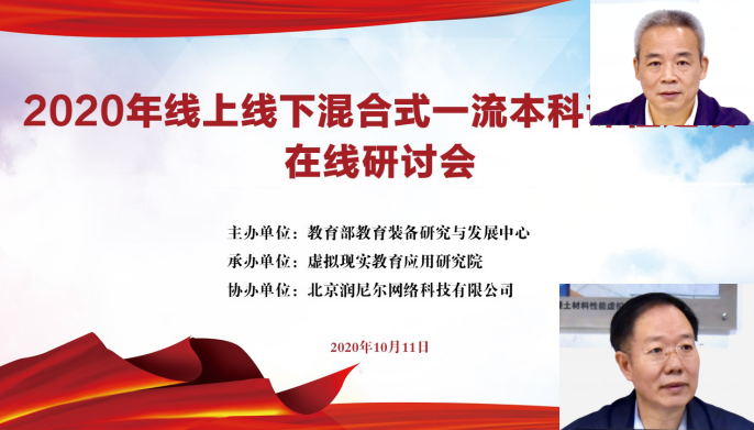 为贯彻落实《教育部关于一流本科课程建设的实施意见》和《教育部办公厅关于2017-2020年开展示范性虚拟仿真实验教学项目建设的通知》文件精神,聚焦信息技术与教学深度融合背景下的智慧教学和课堂教学改革,利用虚拟仿真教学手段开展线上线下混合式一流课程建设,树立课程建设新理念,推进课程改革创新,实施科学课程评价,提高教师教学能力,由教育部教育装备研究与发展中心主办,虚拟现实教育应用研究院承办,北京润尼尔网络科技有限公司协办的“2020年线上线下混合式一流本科课程建设在线研讨会”于10月11日以在线方式顺利举行。会议由教育部教育装备研究与发展中心职业教育与高等教育装备处刘俊波处长和北京邮电大学国家级电子信息虚拟仿真实验教学中心副主任文福安教授主持。全国共有460所高校的1647名老师参会,累计3989人次观看直播。