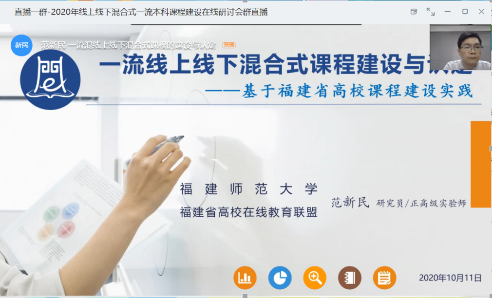 范新民研究员作了“一流线上线下混合式课程建设与认定—基于福建省高校课程建设实践”的报告,报告围绕一中心、两原则、三突出、聚焦“四新”、做好“五融合”的总体要求,对如何做好一流线上线下混合式课程建设与认定,如何建设好课程内容,体现前沿性、时代性、优质性和“混合性”等内容进行阐释。