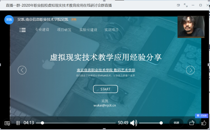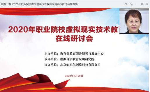 为贯彻落实《国家职业教育改革实施方案》和《教育信息化2.0行动计划》文件精神,适应“互联网+职业教育”发展需求,运用现代信息技术改进教学方式方法,推进虚拟工厂等网络学习空间建设和普遍应用,加强职业院校、高等学校虚拟仿真实训教学环境建设,服务信息化教学需要。由教育部教育装备研究与发展中心主办,虚拟现实教育应用研究院承办,北京润尼尔网络科技有限公司协办的“2020年职业院校虚拟现实技术教育应用在线研讨会”于8月20日以在线方式顺利举行。会议由教育部教育装备研究与发展中心职业教育与高等教育装备处包蕾副处长主持。全国共有516所高校的2166名老师参会,累计6314人次观看直播。