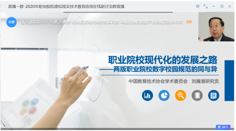 中国教育技术协会刘雍潜研究员作了“职业院校现代化的发展之路-两版职业院校数字校园规范的同与异”的报告,阐述了编制职业院校数字校园规范的意义与作用、目标与原则、内容与形式。报告着重分析了2020版“规范”的创新点:坚持以人为本的思想引领规范编制,突出技术与组织两大体系的作用,重视虚拟仿真在职教教学中的作用,体现了高职院校的教育教学特色,完善了规范体系的评价指标。