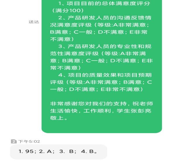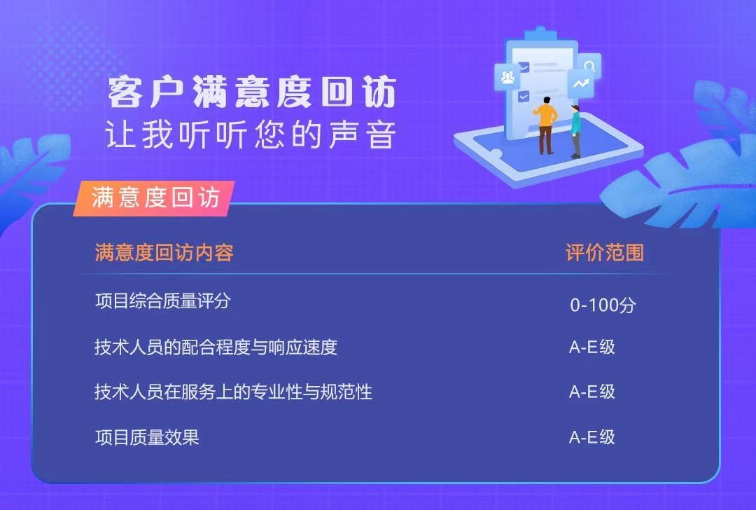基于提高公司服务项目质量以及客户满意度的战略目标,2020年年末,公司质量管理部人员对2020年所有定制项目进行项目质量和客户满意度回访,回访内容包括项目综合质量评价、技术人员的配合与响应程度、技术人员在服务上的专业性与规范性以及项目质量效果等四个方面。通过了解客户满意度的同时,也能为公司定位到新的一年里质量改进与完善的大方向。