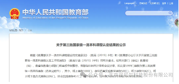 8月21日,教育部公布了关于第三批国家级一流本科课程认定结果的公示。
