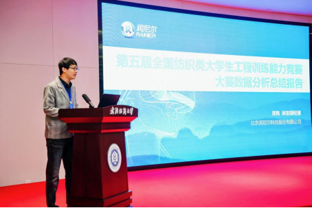 北京润尼尔科技股份有限公司研发经理郑炜,在会议上作了《第五届全国纺织类大学生工程训练综合能力竞赛学生评价数据分析报告》的分享。他汇报了此次大赛各组的参赛人数和实验项目评价人数,公布了各个组别学生最喜爱的实验项目,并介绍了润尼尔打造的以AI为核心的无边界智能学习环境。为未来纺织服装虚拟仿真实验教学的体系化、标准化、装备化进程提供了有力的支撑。