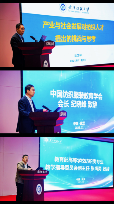 开幕式上,中国工程院院士、武汉纺织大学党委书记徐卫林,中国纺织服装教育学会会长纪晓峰,教育部高等学校纺织类专业教学指导委会副主任、武汉纺织大学教授张尚勇先后发表致辞,对大会的召开表示祝贺,并围绕纺织人才培养的时代使命分享了见解。