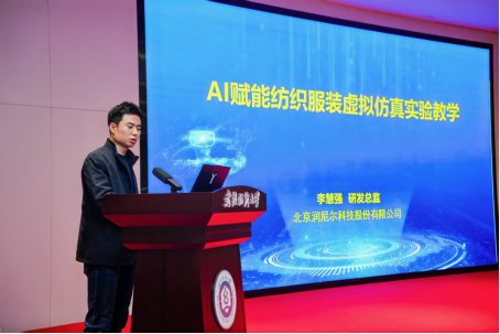 作为虚拟仿真教学领域的领军企业,北京润尼尔科技股份有限公司受邀参会并作主题报告。公司研发中心总监李慧强带来《AI赋能纺织服装虚拟仿真实验教学》专题报告,结合虚拟仿真实验教学的发展趋势,以及VR+AI的技术特点,详细阐述了AI赋能虚拟仿真实验的设计思路,同时系统讲解了典型VR教学形式及适配课程,为高校相关教学实践提供了可落地的参考方案。