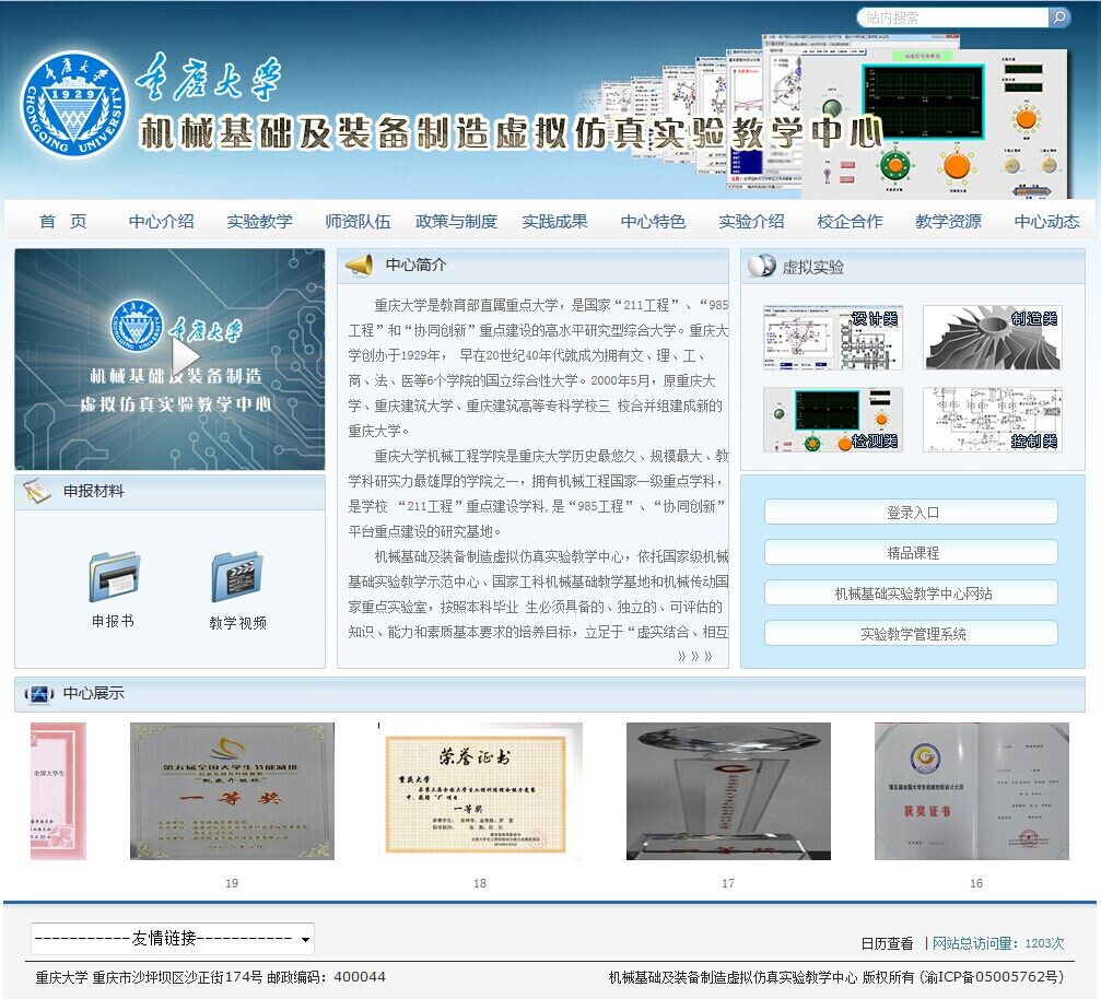 重庆大学创办于1929年,早在20世纪40年代就成为拥有文、理、工、商、法、医等6个学院的国立综合性大学;2000年5月原重庆大学、重庆建筑大学、重庆建筑高等专科学校三校合并组建成新的重庆大学,是教育部直属重点大学,国家“211工程”、“985工程”和“2011协同创新”重点建设的高水平研究型综合大学。重庆大学机械工程学院始建于1935年,是重庆大学历史最悠久、规模最大、教学科研实力最雄厚的学院之一,拥有机械工程国家一级重点学科和一级学科博士点,拥有国家工科机械基础教学基地、国家级机械基础实验教学示范中心和机械传动国家重点实验室等国家级教学科研平台。机械基础及装备制造虚拟仿真实验教学中心(下称中心),依托机械工程国家一级重点学科和国家级教学科研平台,按照本科毕业生必须具备的、独立的、可评估的知识、能力和素质基本要求的培养目标,立足于“虚实结合、相互补充、能实不虚”的原则,在国家“211”工程、“985”工程及校院专项建设资金的支持下,已建设成为国内一流的虚拟仿真实验教学中心。