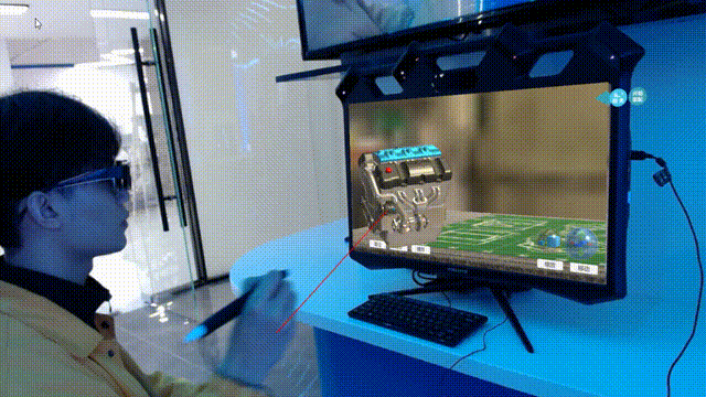 学习者佩戴专用立体眼镜后,通过操控笔,即可进入3D视觉效果,通过亲自动手实操,可以加深对专业知识的理解,提高动手操作能力。桌面VR交互系统,既能让佩戴立体眼镜的单人观看,也能让旁观人群观看,适合小组式教学演练或一对一教学演练。