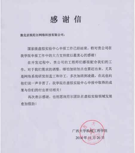 2014年11月20日,北京润尼尔网络科技有限公司收到来自广西大学机械工程学院的一封感谢信。