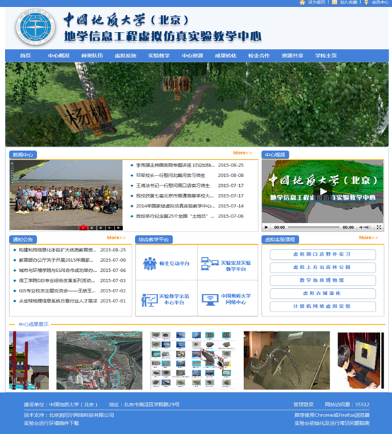 地学信息工程虚拟仿真实验教学中心是在国家级地质资源勘查实验教学中心、北京市计算机实验教学示范中心等实验教学平台基础上构建的。中心结合优势学科和国家特色专业、国家卓越工程师教育培养计划,坚持虚实结合、相互补充、能实不虚的建设原则,崇尚“基础支撑,技术引领,高端应用,创新提能”的创新教育理念,在整体探索中紧扣“支撑”与“引领”两个关键点,以先进的计算机、网络、移动互联、大数据、云计算、增材制造等技术为主要手段,通过顶层设计、师生共建、校企互研、五化分型、协同发展等途径,充分利用现有实验教学平台和学校科技平台的资源,在网络环境、虚拟实验环境和物理实体环境下,完成了5个专业领域的虚拟实验教学平台和20余个典型虚拟实验案例。