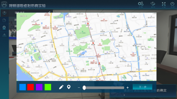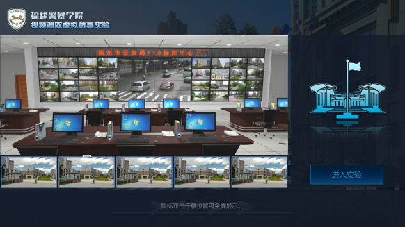 实验系统模拟视频侦查用到的场景、过程、规范程序、技术和方法,通过虚拟仿真的形式还原视频侦查在案件侦查中的操作,将视频现场勘查、视频调取、视频图像分析、战法等内容串联起来形成视频侦查教学系统。