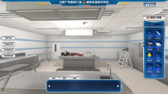 在法医尸体解剖三维虚拟资源建设中,通过虚拟仿真的形式,真实还原了尸体解剖的全过程,包括尸表检验,尸体衣物检查,尸体伤口检查,尸体胸部解剖,尸体腹部解剖,尸体脑部解剖,尸体缝合,尸体各器官解剖检查等环节。