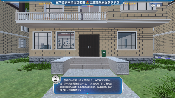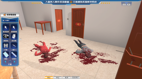 刑事案件侦查三维虚拟仿真实验教学系统,主要通过虚拟仿真的形式模拟入室杀人案件现场勘查、室内盗窃案件现场勘查、室外抢劫案件综合实验。该教学系统既着重训练学生对现场勘查技能的学习能力,又让学生学习体验案件发生到侦破的全过程。