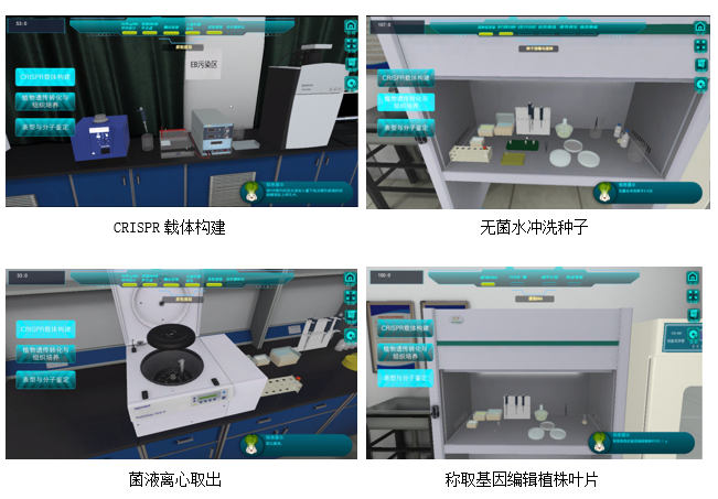 2019年,润尼尔公司与山西大学合作开发了基于CRISPR 技术的白菜基因编辑及遗传转化虚拟仿真综合实验。实验以新兴的CRISPR基因编辑技术为背景,以白菜基因编辑为主题,通过三维仿真技术模拟了PCR仪、电泳电流仪、凝胶系统、恒温振荡培养箱、移液枪、离心机等设备模型,再现真实实验流程。实验内容包括:CRISPR载体构建、植物遗传转化与组织培养、表型与分子鉴定。学习者可通过学习模式、考核模式学习巩固基于CRISPR技术的白菜基因编辑及遗传转化实验的全过程。
