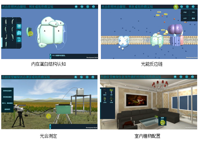 本实验有效解决了微观实验无法进行教学演示的问题,可形象化展示光合作用光能吸收转化的微观过程,让学生通过交互操作更加深入地学习与了解;同时,解决学生无法实际进行光合测定和植物配置的问题。