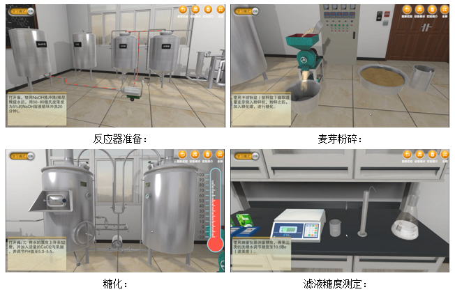 2017年,润尼尔公司与华东理工大学合作开发了糖化酶催化啤酒发酵及酵母菌与大肠杆菌生物发酵虚拟仿真实验。实验重点展示实验室、工厂等场景的设备仪器,包括发酵罐、粉碎机、双氧水罐、水罐、糖化罐、测量仪等,严格还原了啤酒发酵工艺流程车间的设备和管线布局。实验包括反应器准备、生物催化剂应用、啤酒花作用机制、发酵调控等知识点,可运用在生物化学、发酵工程、微生物等实验教学中。