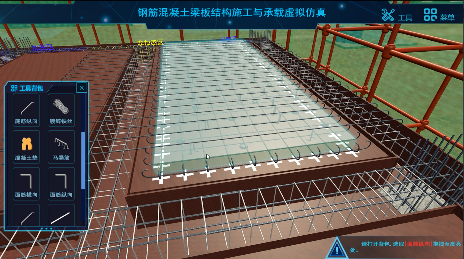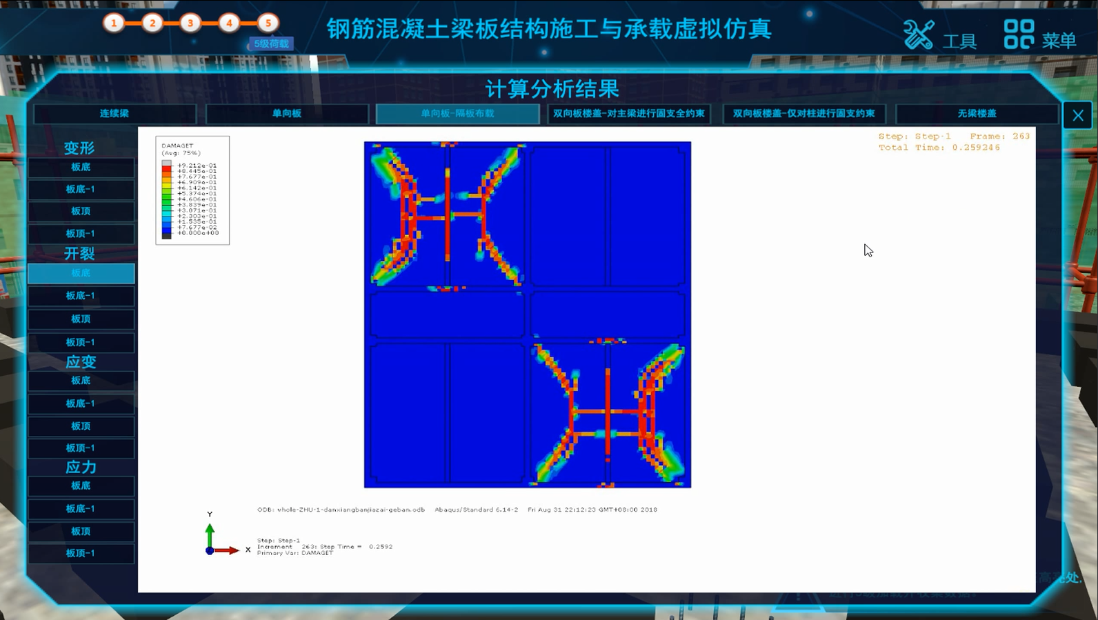 钢筋混凝土楼盖承载破坏实验受结构体量、实验成本和空间限制,在实验教学中难以实现。本项目采用unity3d建模并结合有限元计算等手段,虚拟仿真实体实验不可能实现的钢筋混凝土楼盖模型建造和承载破坏过程,直观展示钢筋混凝土楼盖的应力、应变和变形动态响应等过程,使得实体实验中测试复杂的裂隙和变形、看不见的钢筋和混凝土的应力、应变,以彩色云图的形式生动得呈现在学生面前,从而促进理论教学,提高学生的创新能力。