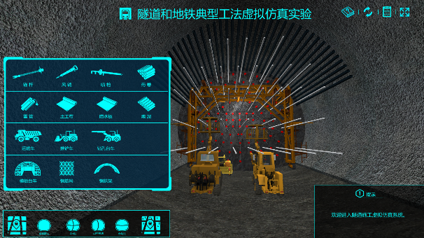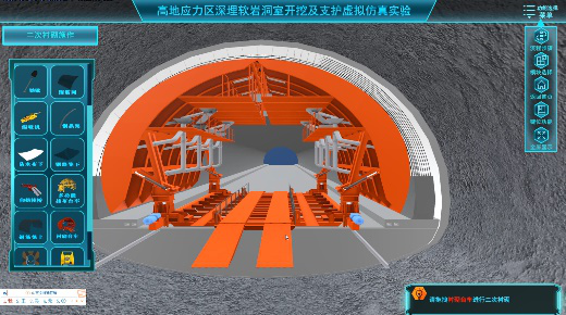 高地应力深埋软岩洞室开挖涉及高危复杂环境,属于隐蔽性工程,不可反复展示施工过程,难以开展实践教学。为响应国家战略,填补教学空白,本项目基于仿真平台再现了高地应力深埋软岩洞室开挖、支护及监测的14道主要步骤,86道工序,涵盖了施工准备、开挖支护、前沿探索三大模块,100余交互操作。项目手段多样,实现了动态直观教学,核心技术高效互动。再运营和管理模式上实现了科教创新融合,校企共建共享。
