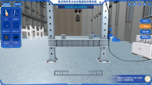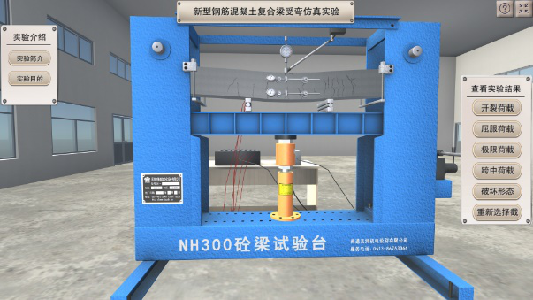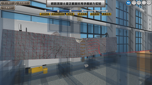 梁式构件受力全过程实验是土木教学中最基础的实验,同时也是专业核心课《混凝土结构原理》和《钢结构设计原理》的核心内容。本项目利用3D仿真和虚拟现实技术,真实再现了混凝土梁和钢梁构件的受弯破坏全过程。通过设计钢筋混凝土梁及钢构件的实验参数,获得钢筋混凝土梁及钢梁构件的不同破坏模式,使学生深刻理解梁氏构件的受弯特性和破坏特性。