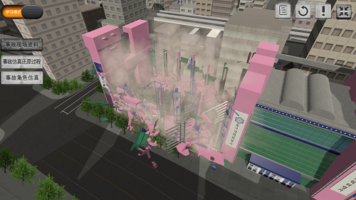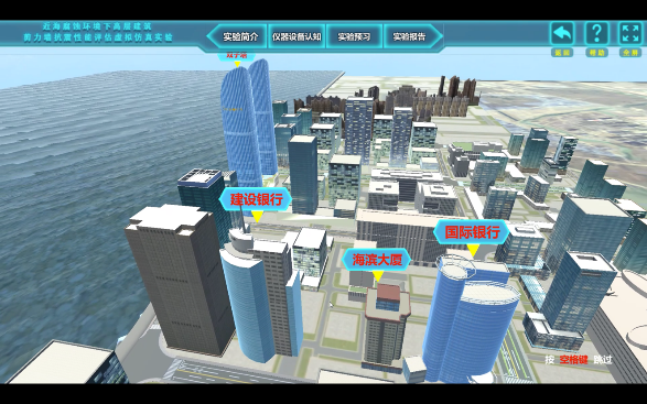 围绕防灾减灾,通过三维仿真技术,系统再现了风洞试验和振动台实验,并详细展示了框架结构的破坏效果,很好地解决了现实实验中的诸多问题,譬如大型设备受限于场地,实物实验学生无法观察到建筑的破坏形式等。