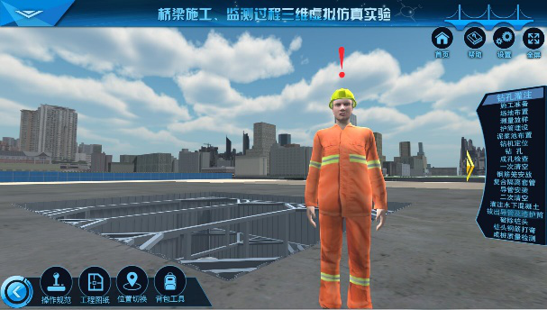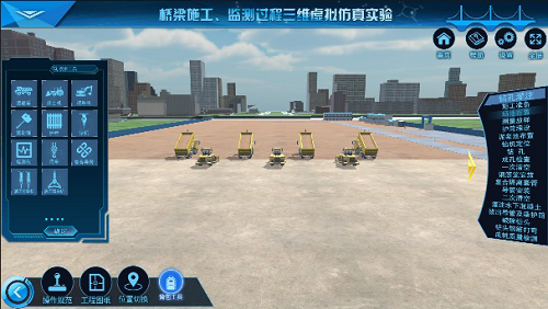 2017年,我公司为浙江大学建筑工程学院量身定制开发了一套桥梁施工、监测过程虚拟仿真实验教学资源,实验资源包括五大模块:基础知识、施工模拟、施工监控、健康监测、灾害仿真,其中施工模拟模块又包含了具体的施工流程:钻孔灌注桩、施工准备、场地布置、放样等19个步骤。
