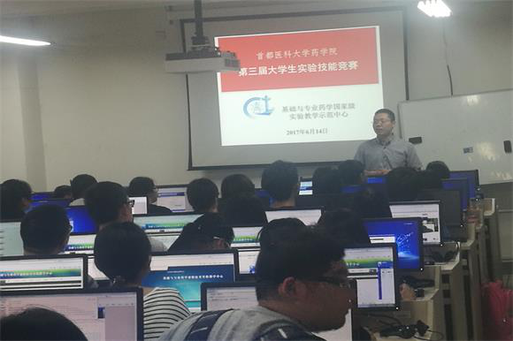 2017年6月14日大学生竞赛在首都医科大学第二教学楼四层计算机实验室举行,参赛学生有2015级、2016级药学、临床药学专业共计70人。竞赛完全采取网络开放式虚拟仿真实验的形式进行。