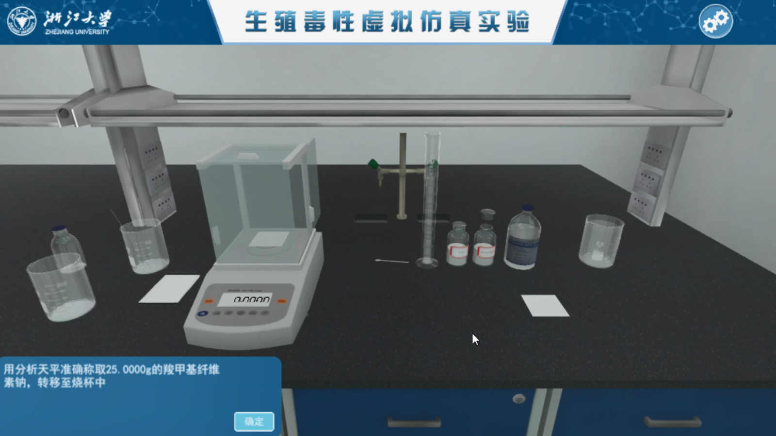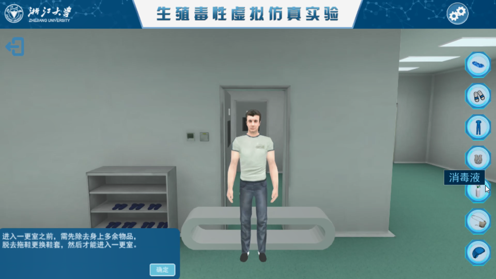 2019年6月,我公司与浙江大学药学院进行合作定制开发了生殖毒性虚拟仿真实验。进入实验后,学生可通过图文及视频内容进行实验的预习,在虚拟仿真的实验室系统内,通过WSAD操纵实验人物完成真实实验中进入生物安全实验室需要的准备工作。