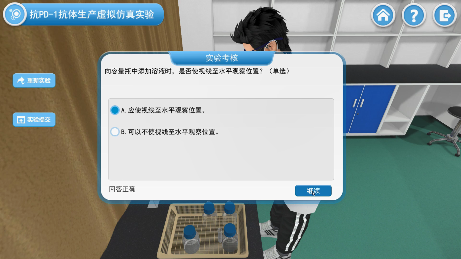 抗PD-1抗体生产过程中高效液相分析抗体含量的操作技能对药学专业学生的仪器分析能力培养非常重要,但由于其操作复杂、实验要求高和条件限制,在实体实验中难以完成。学生通过在三维场景中实现从流动相脱气、仪器预热、参数设置、高效液相使用、分析方法设置、数据整理等方面的演练操作,熟悉高效液相分析的操作过程,根据实验操作提示和物体高亮提示,使用各种工具进行实验操作,最后完成整体的实验流程;关键计分点在无操作提示条件下进行实验操作,系统可自动判断操作是否正确,实验操作结束后,针对操作过程设置考核点可弹出最终操作得分。