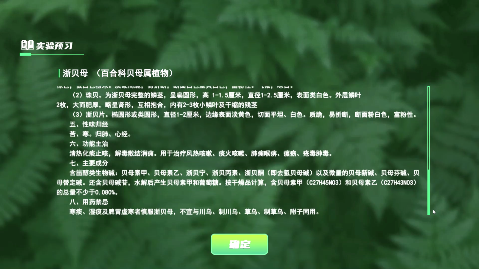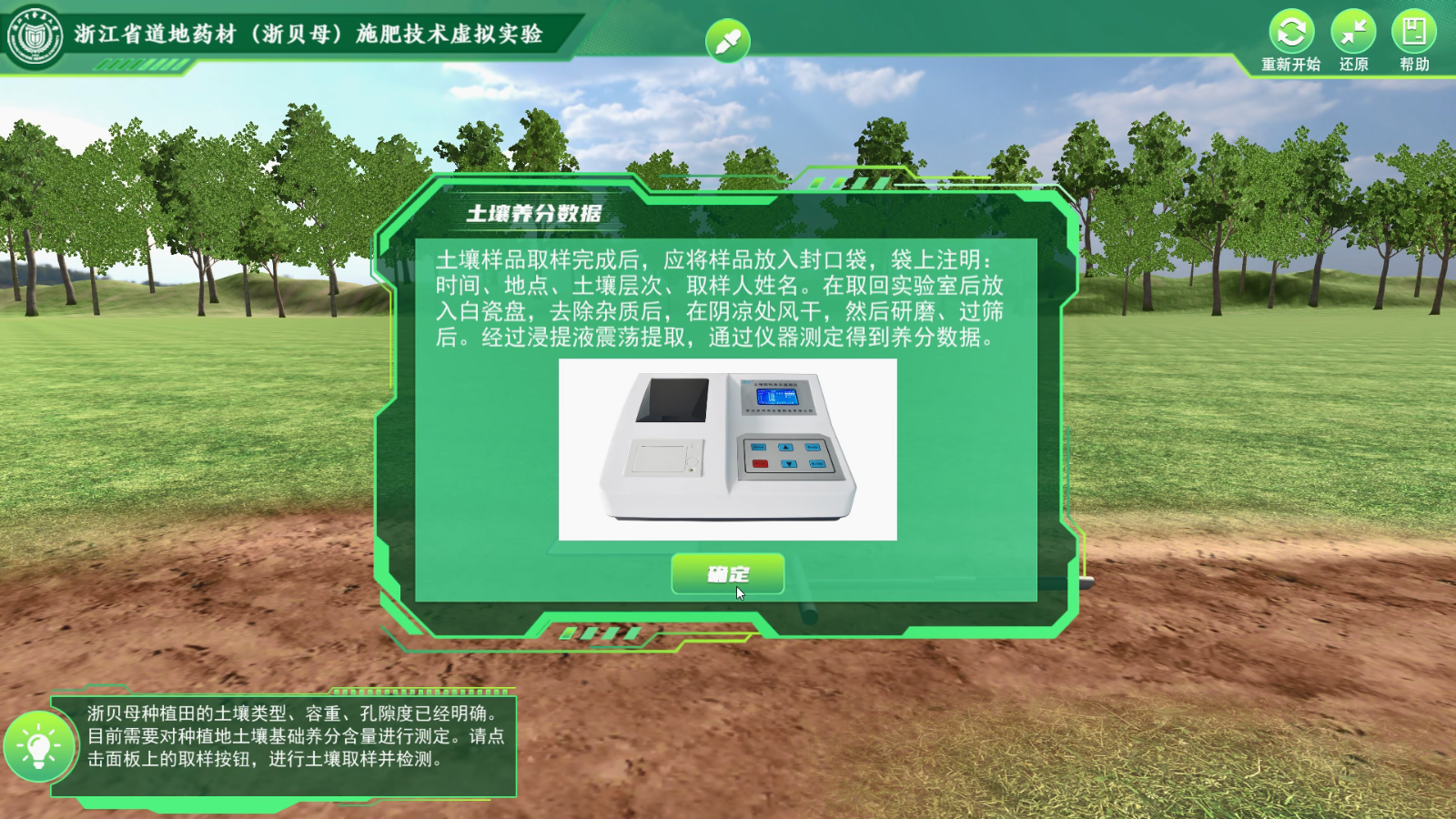 2020年8月,我公司与浙江中医药大学药学院进行合作定制开发了浙江省道地药材施肥技术虚拟实验,该虚拟仿真实验课程真实还原了浙江省道地药材浙贝母的施肥技术与含量分析的过程。虚拟仿真实验结合相关理论知识,学生可以反复进行实验和学习,从而提高学生理论水平和实践能力,节省大量教学资源和时间。