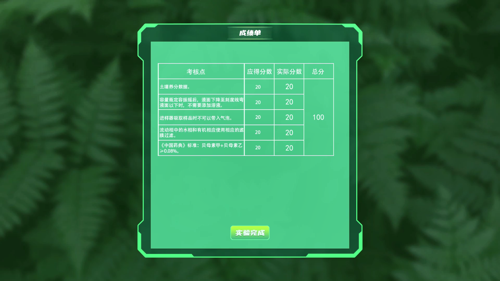浙江省道地药材浙贝母的施肥技术与含量分析的操作技能对药学专业学生的仪器分析能力培养非常重要,但由于其操作复杂、实验成本时间较高和场地条件限制,在实体实验中难以完成。学生通过在三维场景中实现从各周期浙贝母植株施肥方案设计、植株生长数据分析、浙贝母收获、高效液相使用、分析方法设置、数据整理等方面的演练操作,熟悉浙贝母施肥方式方法、高效液相分析的操作过程,根据实验操作提示和物体高亮提示,使用各种工具进行实验操作,最后完成整体的实验流程;关键计分点在无操作提示条件下进行实验操作,系统可自动判断操作是否正确,实验操作结束后,针对操作过程设置考核点可弹出最终操作得分。