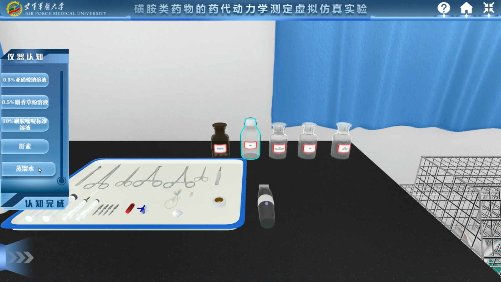 该实验可以作为实物动物实验的补充和替代,在虚拟实验环境中,用户可以根据系统文字图片提示,控制鼠标键盘进行交互,多视角观看动物实验操作、选择注射器、手术刀、药剂、镊子等实验仪器或工具进行操作,掌握相关知识点。用户能通过完成该虚拟实验,达到认知实验总体流程,掌握病毒感染动物的过程及检测指标;中毒模型的建立及解救;容积测量仪的使用等操作方法,掌握实验相关理论知识。