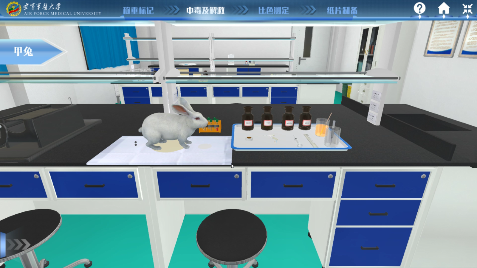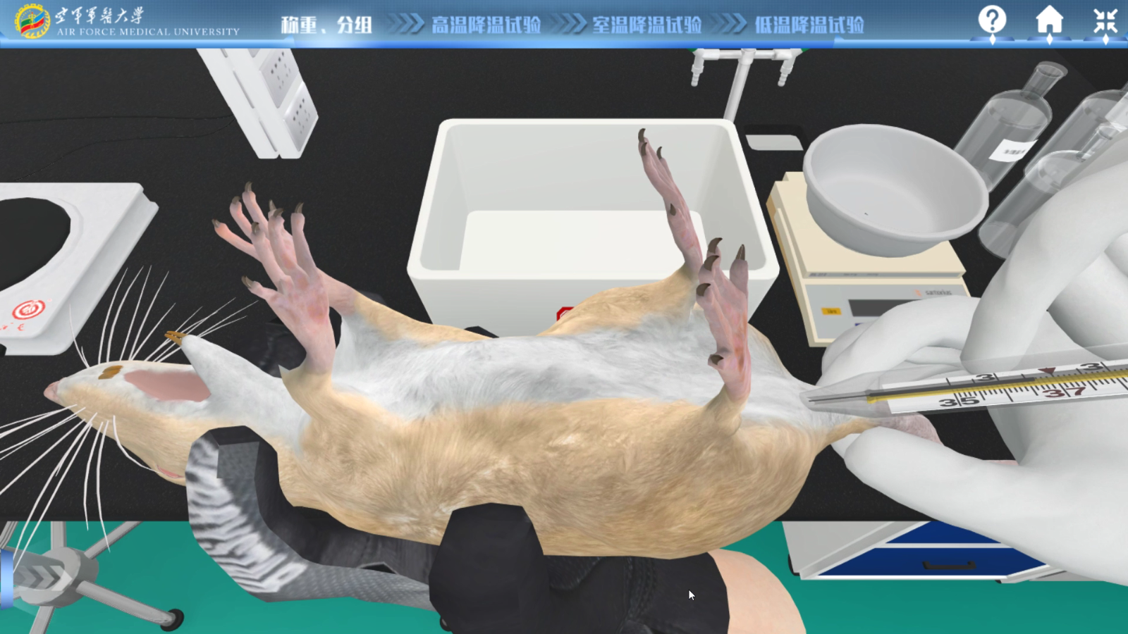 2020年4月,我公司与空军军医大学药学系进行合作定制开发了药理学虚拟实验模块开发、数据库及网站建设。通过三维仿真技术,还原药理学实验室、屏障进出场景,实验中包括实验原理、实验简介、实验操作帮助、虚拟实验、思考题等实验内容,学习者通过该系列实验课程,不仅对药理学实验室安全防护有全面的熟悉,而且还能熟练掌握家兔备皮、麻醉、颈部解剖;大鼠腹部注射、皮下注射、标记;离心机的使用等具体知识技能。